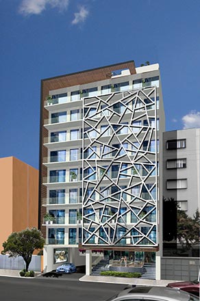 Vivienda Residencial Plus de 14 niveles y 4 sótanos de estacionamiento, con 33 departamentos de 2 recamaras, 2 baños, sala, comedor, cocina. Edificado en un terreno de 489 m² en 4,842.5 m² de construcción.
